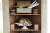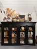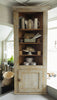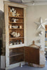 Fabulous, immense size Corner Cabinets with original paint. Beautiful patina to the wooden shelves, with a single door to the bottom of these magnificent cabinets. The cabinets are not completely identical; the shelf layout is slightly different and the skirting at the base are different widths. Nonetheless, they are a pair, sourced together and both have the original gorgeous paint colour. These cabinets provide the perfect show piece for displaying your decorative treasures and are certainly statement pieces due to their monumental size.